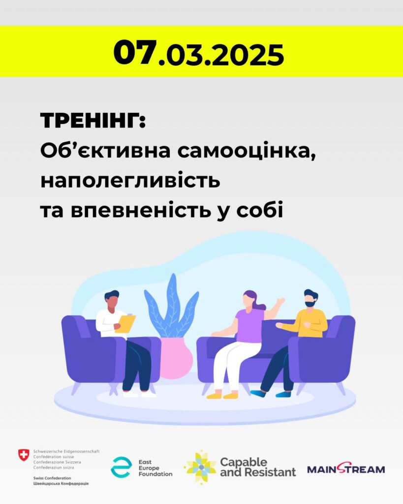 Тренінг проходить в рамках проєкту “DIM – Досконалі Ідеї Майбутнього” реалізується Громадською Організацією «Мейнстрим» в межах програми «Спроможні та сильні», що впроваджується Фондом Східна Європа за сприяння Швейцарії
